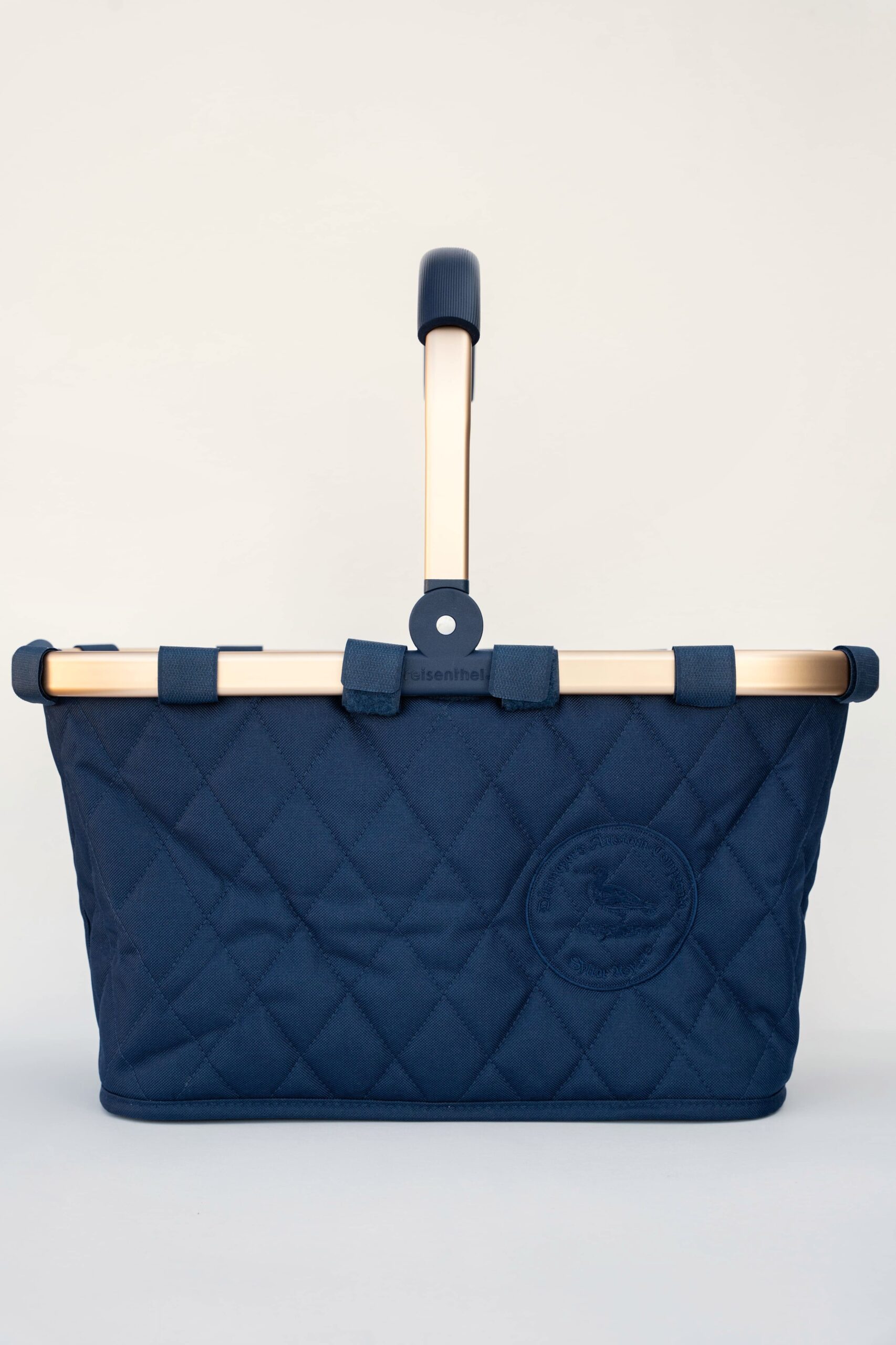 Sylter Royal Carrybag – robuster Einkaufskorb mit wattierter Rautensteppung, edlem Alurahmen und maritimem Branding. Praktisch, stilvoll und perfekt für Alltag, Markt oder Strand.